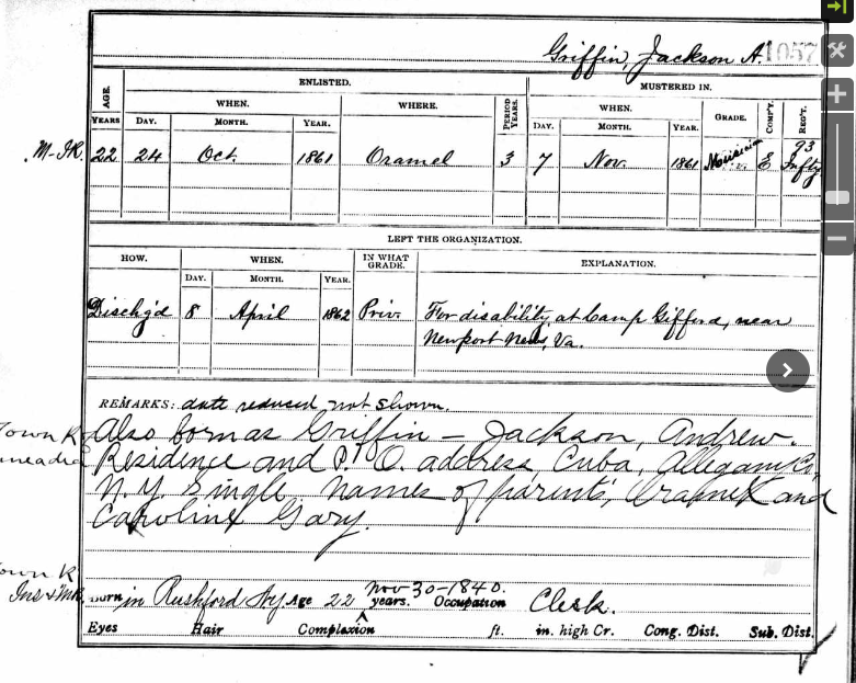 The only time Joel appears in Milton’s household by name is in the 1860 Census taken in New Hudson, Allegany, NY.. He is listed as age 26 indicating a date of birth in 1834/5. That date is a match for the two young boys recorded in the 1840 census in Malone, Franklin, NY. His Civil war enlistment papers place his date of birth in 1836. There are NY Census records taken in 1870, 1875 and 1880 in Salamanca, Cattaraugus, NY, which records a Joel Griffin born about 1835 in Franklin County and his wife Betsy born in Allegany County. Those dates and places are a match for what you would expect to find for Milton’s son, Joel. The confirmation for his identity is found in his will probated on November 18, 1880. In his will he provides money for Mrs. Milton Griffin, his mother. He also leave money to a nephew, William Shean, son his his sister Mary.-----------